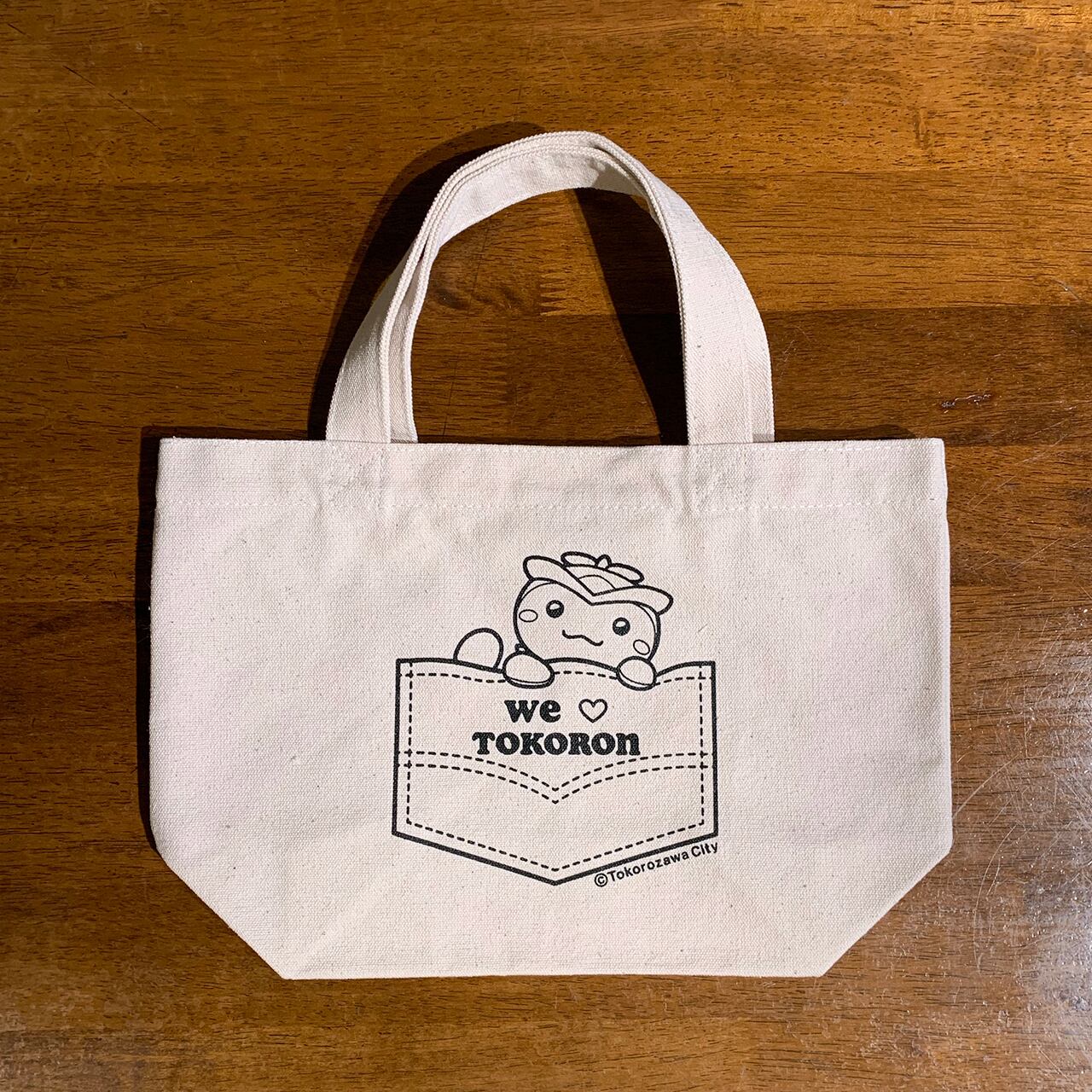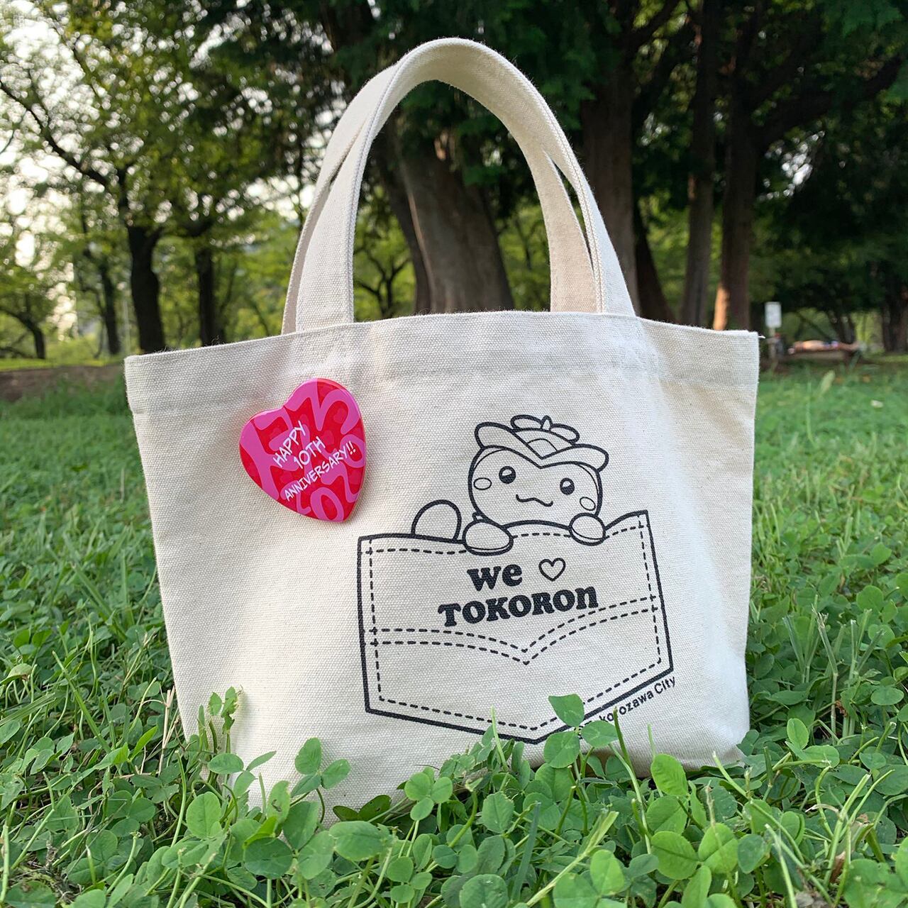このミニトートバッグにはトコろん生誕10周年記念缶バッジが付いています